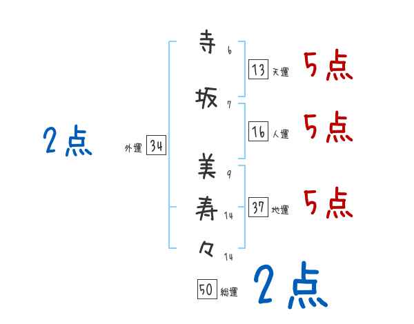 人運![]() | 寺坂美寿々さんの人運は16画の5つ星!人望が厚く大きく発展する。逆転成功が見える。 性格や才能などを表す2番目に重要な運勢です。人間関係や協調性、社会的な成功に影響します。主に20歳から50歳ぐらいまでの中年期の運勢を表します。 |