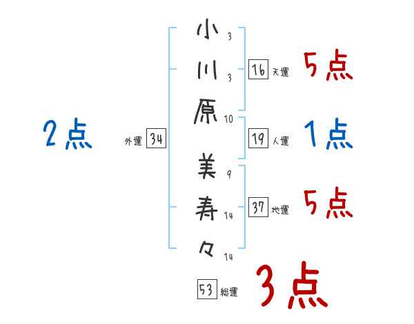 総運![]() | 小川原美寿々さんの総運は53画の3つ星!やや見栄っ張りで虚栄心がある。散財に注意。 あなたの人生を表す1番重要な運勢です。生涯を通じて影響する総合運となり、主に50歳以降の晩年期に影響を及ぼします。 |