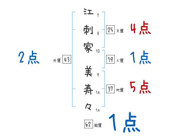 天運![]() | 江刺家美寿々さんの天運は25画の4つ星!個性があり才能があふれる。強運の持ち主で発展する。 家系が持つ宿命的な運勢を表します。祖先から受け継いだ苗字ですので自分の力が及びません。家柄を象徴します。 |