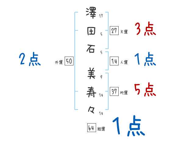外運![]() | 澤田石美寿々さんの外運は50画の2つ星!浮き沈みが激しく不安定。しりすぼみに衰退しやすいので注意しましょう。 生活面を象徴する運勢です。外部から受ける影響力を表し、結婚運、家庭運や職場、環境への順応性を表します。 |