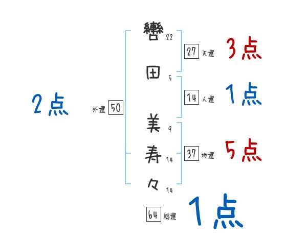 外運![]() | 轡田美寿々さんの外運は50画の2つ星!浮き沈みが激しく不安定。しりすぼみに衰退しやすいので注意しましょう。 生活面を象徴する運勢です。外部から受ける影響力を表し、結婚運、家庭運や職場、環境への順応性を表します。 |