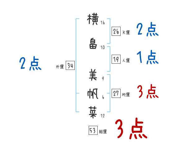 総運![]() | 横畠美帆菜さんの総運は53画の3つ星!やや見栄っ張りで虚栄心がある。散財に注意。 あなたの人生を表す1番重要な運勢です。生涯を通じて影響する総合運となり、主に50歳以降の晩年期に影響を及ぼします。 |