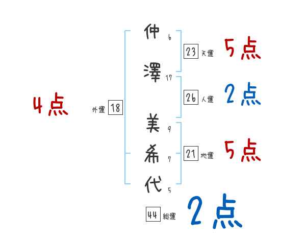 総運![]() | 仲澤美希代さんの総運は44画の2つ星!誠実で慎重な性格。物事を考えすぎないように注意しましょう。 あなたの人生を表す1番重要な運勢です。生涯を通じて影響する総合運となり、主に50歳以降の晩年期に影響を及ぼします。 |