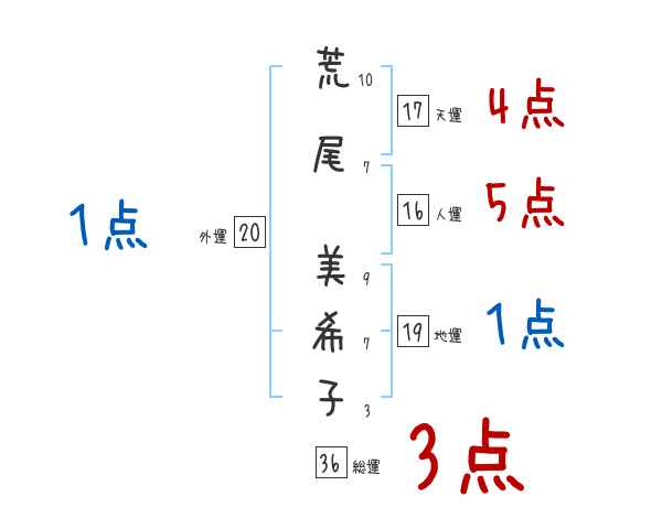 天運![]() | 荒尾美希子さんの天運は17画の4つ星!積極的な行動力。地位を気づき財産を手に入れる。純粋な心と直感力。 家系が持つ宿命的な運勢を表します。祖先から受け継いだ苗字ですので自分の力が及びません。家柄を象徴します。 |