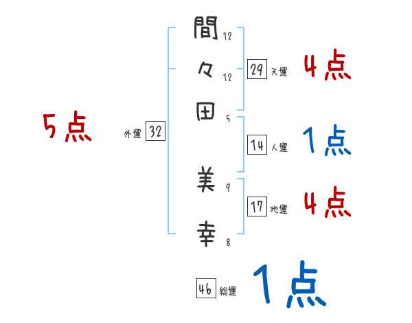 外運![]() | 間々田美幸さんの外運は32画の5つ星!柔軟性があり成功する。チャンスが多く金運が良い。 生活面を象徴する運勢です。外部から受ける影響力を表し、結婚運、家庭運や職場、環境への順応性を表します。 |
