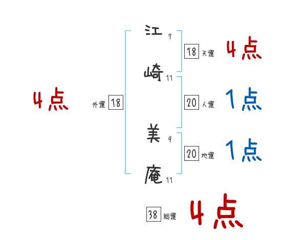 天運![]() | 江崎美庵さんの天運は18画の4つ星!情熱的で剛気。忍耐力があり信頼される。 家系が持つ宿命的な運勢を表します。祖先から受け継いだ苗字ですので自分の力が及びません。家柄を象徴します。 |