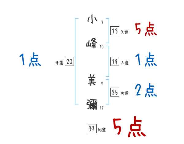 総運![]() | 小峰美彌さんの総運は39画の5つ星!社交性に優れ人望が厚い。人の上に立ち成功する。 あなたの人生を表す1番重要な運勢です。生涯を通じて影響する総合運となり、主に50歳以降の晩年期に影響を及ぼします。 |