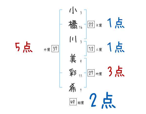 天運![]() | 小橋川美彩希さんの天運は22画の1つ星!努力することが苦手ないっぽう手先が器用。芸術性にも優れる。 家系が持つ宿命的な運勢を表します。祖先から受け継いだ苗字ですので自分の力が及びません。家柄を象徴します。 |