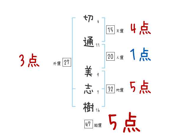 総運![]() | 切通美志樹さんの総運は47画の5つ星!実力が開花し発展する円満な人生。財に恵まれる。 あなたの人生を表す1番重要な運勢です。生涯を通じて影響する総合運となり、主に50歳以降の晩年期に影響を及ぼします。 |