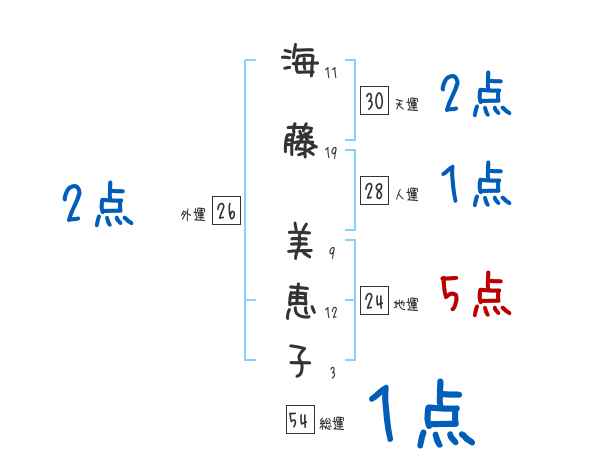 天運![]() | 海藤美恵子さんの天運は30画の2つ星!浮き沈みの激しさに注意しましょう。 家系が持つ宿命的な運勢を表します。祖先から受け継いだ苗字ですので自分の力が及びません。家柄を象徴します。 |