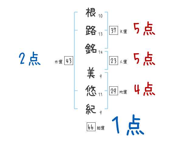 人運![]() | 根路銘美悠紀さんの人運は23画の5つ星!想像力に優れ活力がある。一代で成功し名誉を手に入れる。 性格や才能などを表す2番目に重要な運勢です。人間関係や協調性、社会的な成功に影響します。主に20歳から50歳ぐらいまでの中年期の運勢を表します。 |