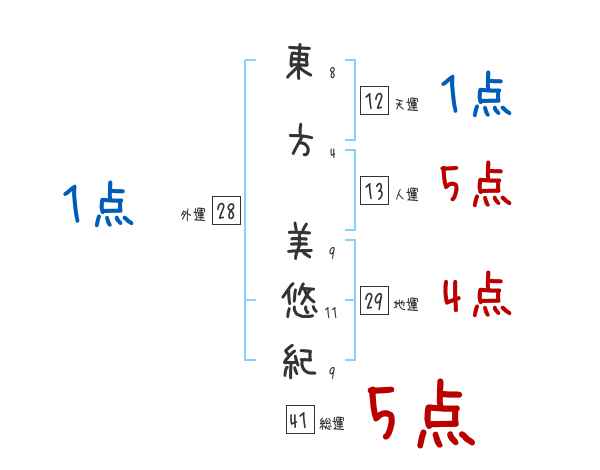 天運![]() | 東方美悠紀さんの天運は12画の1つ星!簡単な失敗で諦めてしまいやすいかも。着実に行動すると良いでしょう。 家系が持つ宿命的な運勢を表します。祖先から受け継いだ苗字ですので自分の力が及びません。家柄を象徴します。 |