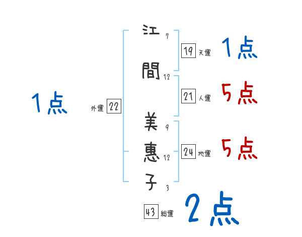 総運![]() | 江間美惠子さんの総運は43画の2つ星!頑固な性格で独立心が強いかも。やや非現実的で浪費に注意しましょう。 あなたの人生を表す1番重要な運勢です。生涯を通じて影響する総合運となり、主に50歳以降の晩年期に影響を及ぼします。 |