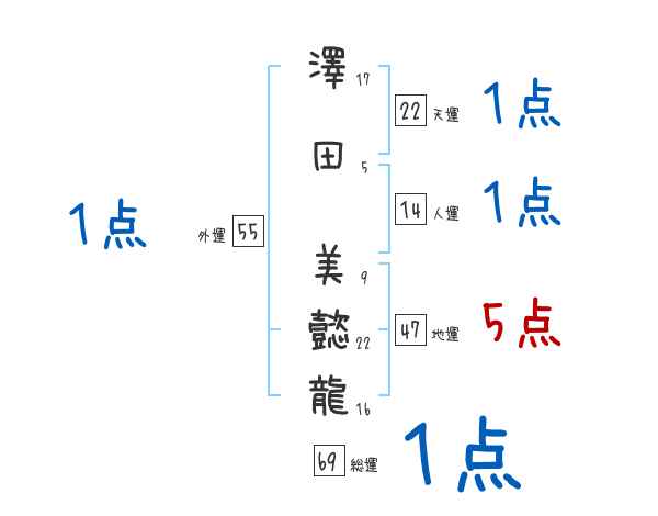 天運![]() | 澤田美懿龍さんの天運は22画の1つ星!努力することが苦手ないっぽう手先が器用。芸術性にも優れる。 家系が持つ宿命的な運勢を表します。祖先から受け継いだ苗字ですので自分の力が及びません。家柄を象徴します。 |