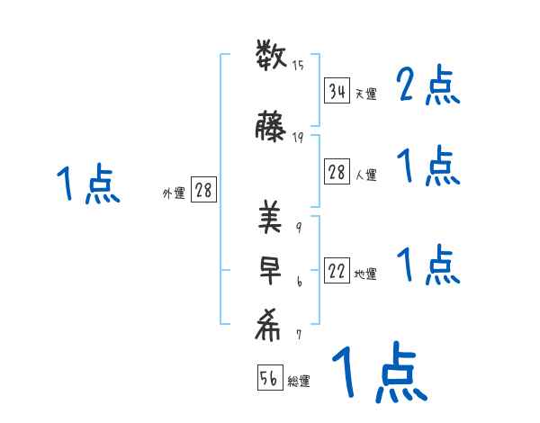 外運![]() | 数藤美早希さんの外運は28画の1つ星!家庭環境に注意。スポーツで活躍できる能力があるかも。 生活面を象徴する運勢です。外部から受ける影響力を表し、結婚運、家庭運や職場、環境への順応性を表します。 |
