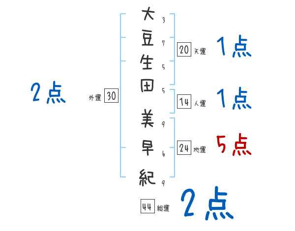 総運![]() | 大豆生田美早紀さんの総運は44画の2つ星!誠実で慎重な性格。物事を考えすぎないように注意しましょう。 あなたの人生を表す1番重要な運勢です。生涯を通じて影響する総合運となり、主に50歳以降の晩年期に影響を及ぼします。 |