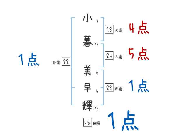 総運![]() | 小暮美早輝さんの総運は46画の1つ星!迷走することが多く苦労するかも。目先のことにとらわれないように。 あなたの人生を表す1番重要な運勢です。生涯を通じて影響する総合運となり、主に50歳以降の晩年期に影響を及ぼします。 |