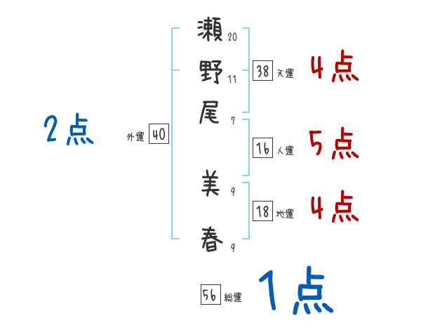 人運![]() | 瀬野尾美春さんの人運は16画の5つ星!人望が厚く大きく発展する。逆転成功が見える。 性格や才能などを表す2番目に重要な運勢です。人間関係や協調性、社会的な成功に影響します。主に20歳から50歳ぐらいまでの中年期の運勢を表します。 |
