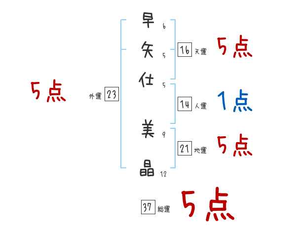 天運![]() | 早矢仕美晶さんの天運は16画の5つ星!人望が厚く大きく発展する。逆転成功が見える。 家系が持つ宿命的な運勢を表します。祖先から受け継いだ苗字ですので自分の力が及びません。家柄を象徴します。 |