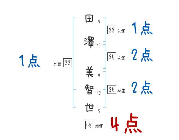 天運![]()  | 田澤美智世さんの天運は22画の1つ星!努力することが苦手ないっぽう手先が器用。芸術性にも優れる。 家系が持つ宿命的な運勢を表します。祖先から受け継いだ苗字ですので自分の力が及びません。家柄を象徴します。 |