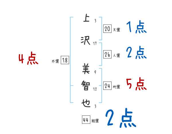 総運![]() | 上沢美智也さんの総運は44画の2つ星!誠実で慎重な性格。物事を考えすぎないように注意しましょう。 あなたの人生を表す1番重要な運勢です。生涯を通じて影響する総合運となり、主に50歳以降の晩年期に影響を及ぼします。 |