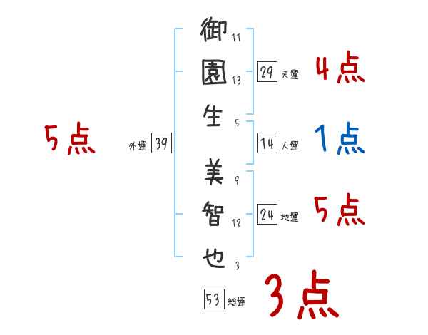 外運![]() | 御園生美智也さんの外運は39画の5つ星!社交性に優れ人望が厚い。人の上に立ち成功する。 生活面を象徴する運勢です。外部から受ける影響力を表し、結婚運、家庭運や職場、環境への順応性を表します。 |
