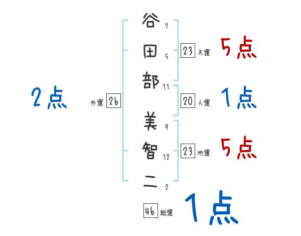 地運![]() | 谷田部美智二さんの地運は23画の5つ星!想像力に優れ活力がある。一代で成功し名誉を手に入れる。 個性を表す基礎的な運勢です。性格形成や対人関係、行動力など家庭環境に影響されます。主に誕生してから20歳くらいまでの若年期の運勢を表します。 |