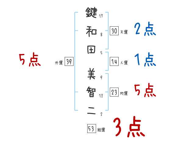 総運![]() | 鍵和田美智二さんの総運は53画の3つ星!やや見栄っ張りで虚栄心がある。散財に注意。 あなたの人生を表す1番重要な運勢です。生涯を通じて影響する総合運となり、主に50歳以降の晩年期に影響を及ぼします。 |