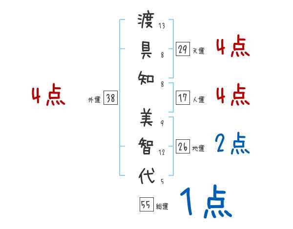天運![]() | 渡具知美智代さんの天運は29画の4つ星!完全主義で才能がある。厳格な心の持ち主。 家系が持つ宿命的な運勢を表します。祖先から受け継いだ苗字ですので自分の力が及びません。家柄を象徴します。 |