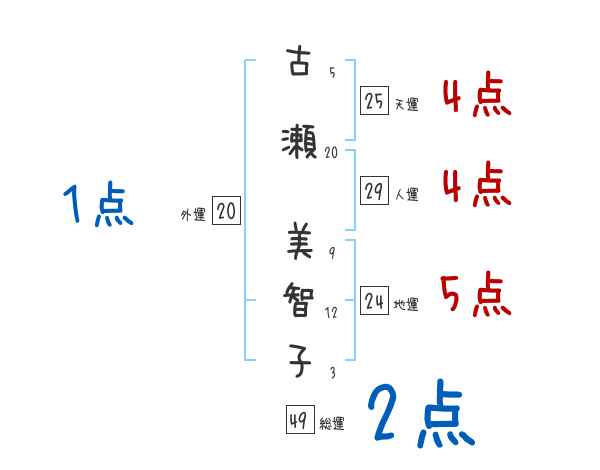 天運![]() | 古瀬美智子さんの天運は25画の4つ星!個性があり才能があふれる。強運の持ち主で発展する。 家系が持つ宿命的な運勢を表します。祖先から受け継いだ苗字ですので自分の力が及びません。家柄を象徴します。 |