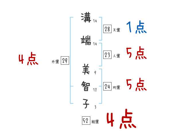 外運![]() | 溝端美智子さんの外運は29画の4つ星!完全主義で才能がある。厳格な心の持ち主。 生活面を象徴する運勢です。外部から受ける影響力を表し、結婚運、家庭運や職場、環境への順応性を表します。 |