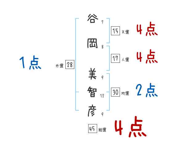 外運![]() | 谷岡美智彦さんの外運は28画の1つ星!家庭環境に注意。スポーツで活躍できる能力があるかも。 生活面を象徴する運勢です。外部から受ける影響力を表し、結婚運、家庭運や職場、環境への順応性を表します。 |