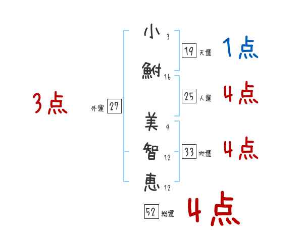 外運![]() | 小鮒美智恵さんの外運は27画の3つ星!頭脳明晰だが強情で摩擦が多い傾向。孤立に注意。 生活面を象徴する運勢です。外部から受ける影響力を表し、結婚運、家庭運や職場、環境への順応性を表します。 |