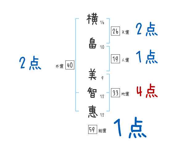 天運![]() | 横畠美智惠さんの天運は26画の2つ星!波瀾万丈かも。信頼できる人を大事にしましょう。 家系が持つ宿命的な運勢を表します。祖先から受け継いだ苗字ですので自分の力が及びません。家柄を象徴します。 |