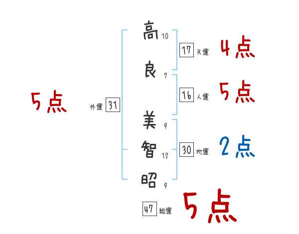 外運![]() | 高良美智昭さんの外運は31画の5つ星!社交性があり判断力に優れる。順風満帆な人生で円満な生活。 生活面を象徴する運勢です。外部から受ける影響力を表し、結婚運、家庭運や職場、環境への順応性を表します。 |