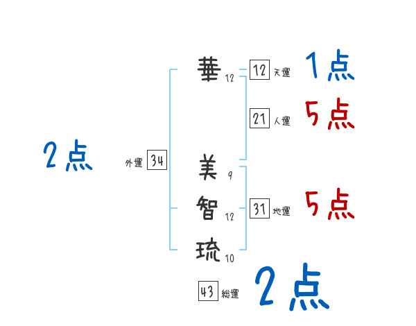 天運![]() | 華美智琉さんの天運は12画の1つ星!簡単な失敗で諦めてしまいやすいかも。着実に行動すると良いでしょう。 家系が持つ宿命的な運勢を表します。祖先から受け継いだ苗字ですので自分の力が及びません。家柄を象徴します。 |