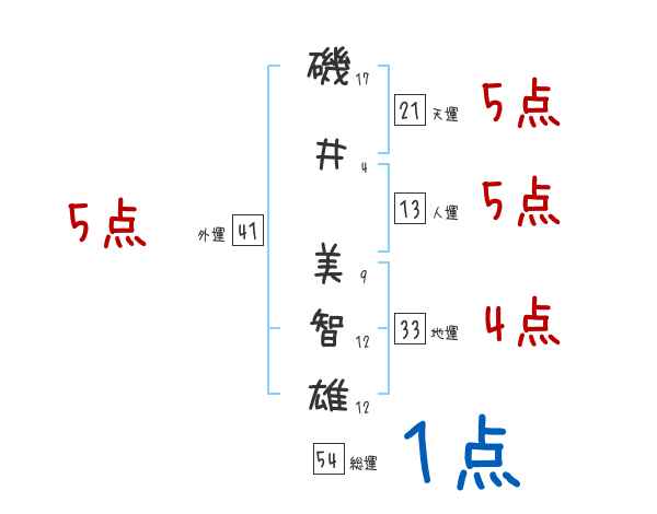 天運![]() | 磯井美智雄さんの天運は21画の5つ星!統率力がある。独立し成功する。名誉を手に入れる。 家系が持つ宿命的な運勢を表します。祖先から受け継いだ苗字ですので自分の力が及びません。家柄を象徴します。 |