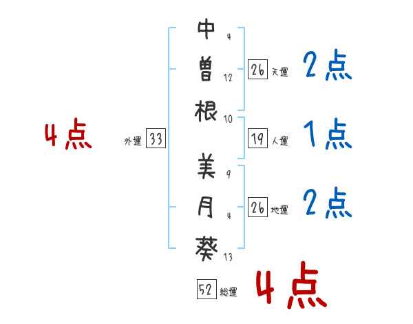 外運![]() | 中曽根美月葵さんの外運は33画の4つ星!権力志向でプライドが高い。勇気があり運を切り開き成功する。 生活面を象徴する運勢です。外部から受ける影響力を表し、結婚運、家庭運や職場、環境への順応性を表します。 |
