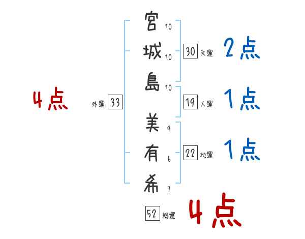 外運![]() | 宮城島美有希さんの外運は33画の4つ星!権力志向でプライドが高い。勇気があり運を切り開き成功する。 生活面を象徴する運勢です。外部から受ける影響力を表し、結婚運、家庭運や職場、環境への順応性を表します。 |