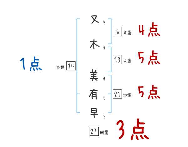 人運![]() | 又木美有早さんの人運は13画の5つ星!才能に恵まれ人気がある。名声を手に入れる。円満な人生。 性格や才能などを表す2番目に重要な運勢です。人間関係や協調性、社会的な成功に影響します。主に20歳から50歳ぐらいまでの中年期の運勢を表します。 |