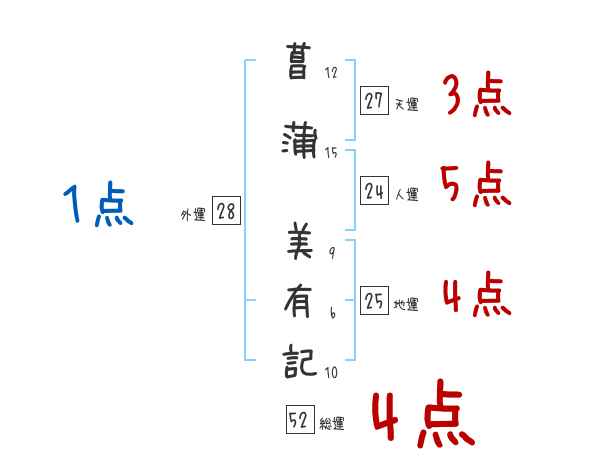 外運![]() | 菖蒲美有記さんの外運は28画の1つ星!家庭環境に注意。スポーツで活躍できる能力があるかも。 生活面を象徴する運勢です。外部から受ける影響力を表し、結婚運、家庭運や職場、環境への順応性を表します。 |