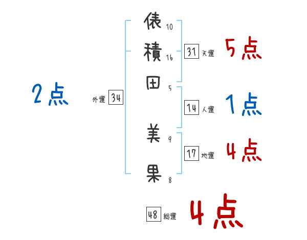 外運![]() | 俵積田美果さんの外運は34画の2つ星!独創性に優れるが、自尊心が強く災難に注意しましょう。 生活面を象徴する運勢です。外部から受ける影響力を表し、結婚運、家庭運や職場、環境への順応性を表します。 |