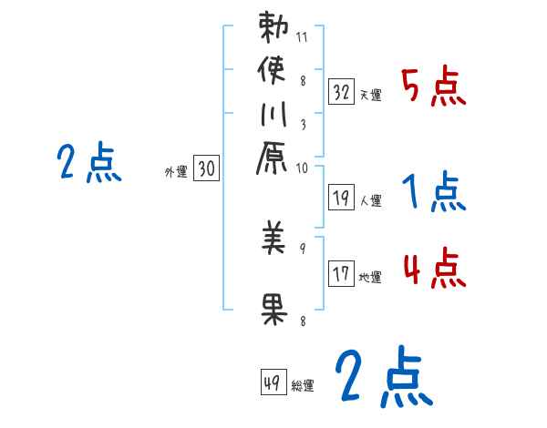 外運![]() | 勅使川原美果さんの外運は30画の2つ星!浮き沈みの激しさに注意しましょう。 生活面を象徴する運勢です。外部から受ける影響力を表し、結婚運、家庭運や職場、環境への順応性を表します。 |