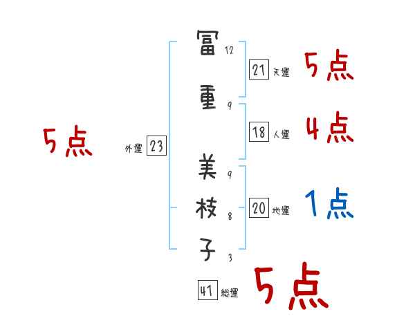 外運![]() | 冨重美枝子さんの外運は23画の5つ星!想像力に優れ活力がある。一代で成功し名誉を手に入れる。 生活面を象徴する運勢です。外部から受ける影響力を表し、結婚運、家庭運や職場、環境への順応性を表します。 |