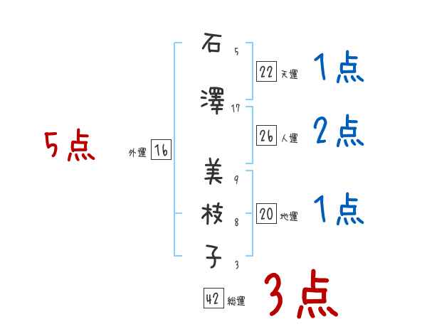 外運![]() | 石澤美枝子さんの外運は16画の5つ星!人望が厚く大きく発展する。逆転成功が見える。 生活面を象徴する運勢です。外部から受ける影響力を表し、結婚運、家庭運や職場、環境への順応性を表します。 |