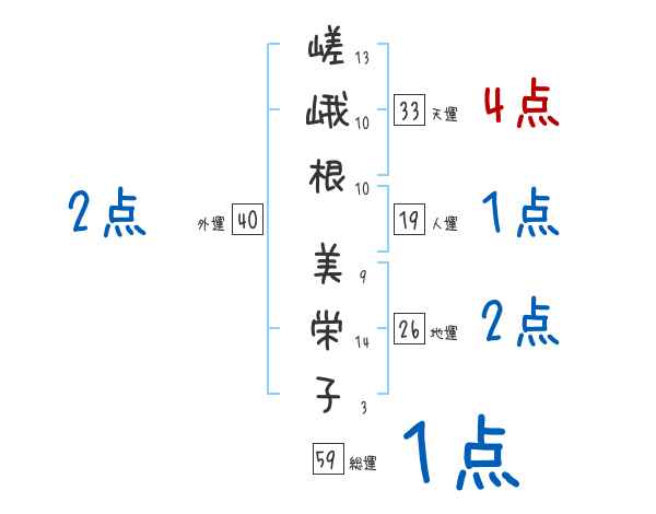 総運![]() | 嵯峨根美栄子さんの総運は59画の1つ星!意志の弱さであきらめることが多いかも。粘り強さが必要。 あなたの人生を表す1番重要な運勢です。生涯を通じて影響する総合運となり、主に50歳以降の晩年期に影響を及ぼします。 |