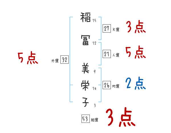 外運![]() | 稲冨美栄子さんの外運は32画の5つ星!柔軟性があり成功する。チャンスが多く金運が良い。 生活面を象徴する運勢です。外部から受ける影響力を表し、結婚運、家庭運や職場、環境への順応性を表します。 |