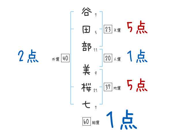 天運![]() | 谷田部美桜七さんの天運は23画の5つ星!想像力に優れ活力がある。一代で成功し名誉を手に入れる。 家系が持つ宿命的な運勢を表します。祖先から受け継いだ苗字ですので自分の力が及びません。家柄を象徴します。 |