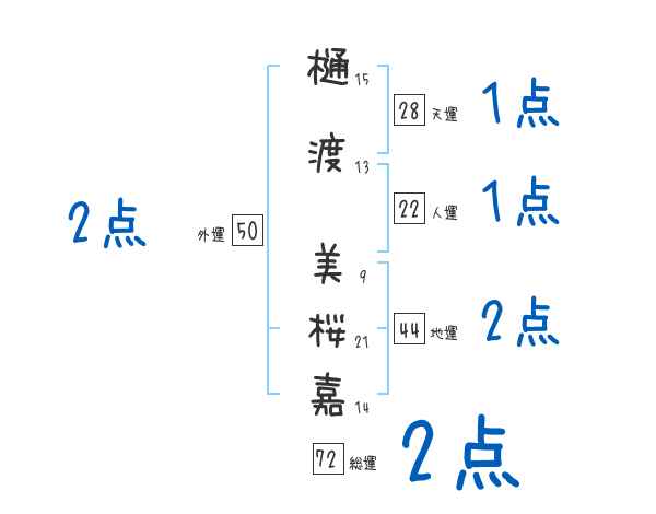 総運![]() | 樋渡美桜嘉さんの総運は72画の2つ星!災難が多く不安定な生活にならないように注意。明暗のある人生かも。 あなたの人生を表す1番重要な運勢です。生涯を通じて影響する総合運となり、主に50歳以降の晩年期に影響を及ぼします。 |