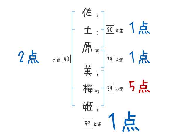総運![]() | 佐土原美桜姫さんの総運は59画の1つ星!意志の弱さであきらめることが多いかも。粘り強さが必要。 あなたの人生を表す1番重要な運勢です。生涯を通じて影響する総合運となり、主に50歳以降の晩年期に影響を及ぼします。 |